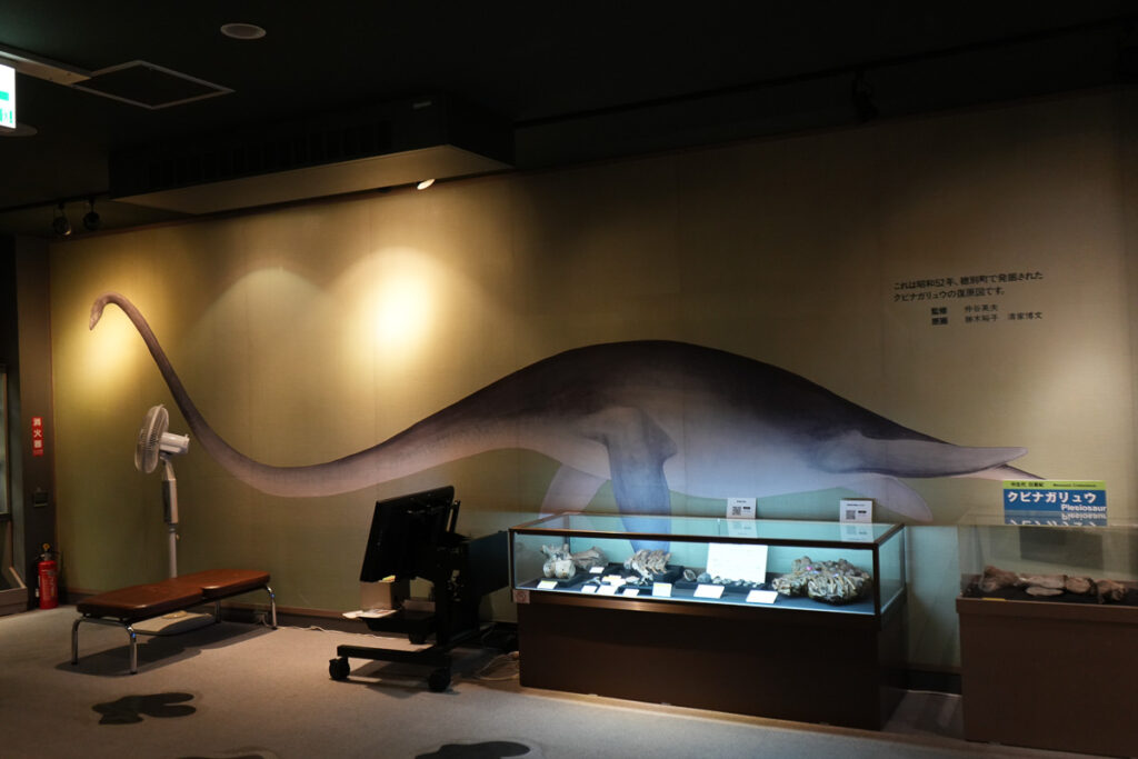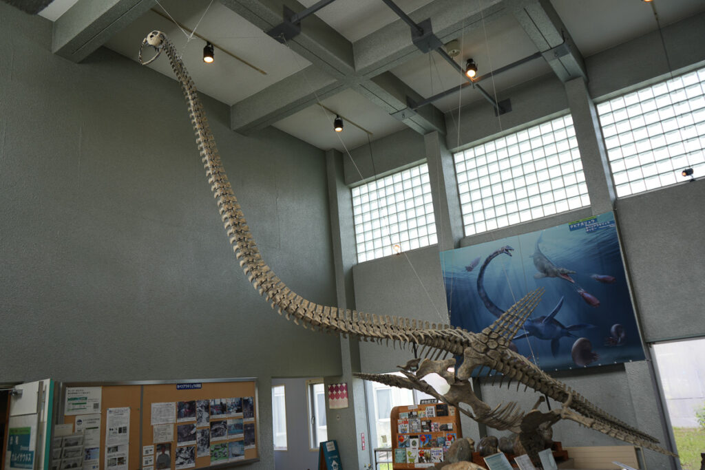 穂別地区は、1億年前〜7,000万年前の白亜紀の地層が分布する、まさに恐竜の宝庫。国内最大の恐竜全身骨格化石「カムイサウルス・ジャポニクス(むかわ竜)」や、博物館のシンボル「ホベツアラキリュウ(クビナガリュウ)」の全身復元骨格が、入口から迫力満点で出迎えてくれます。