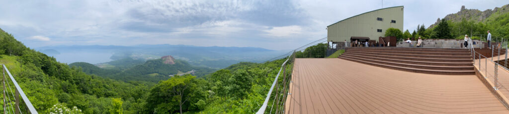 有珠山ロープウェイで標高723メートルの山頂駅へ。ゴンドラから眺める景色も素晴らしく、約6分間の空中散歩では、洞爺湖や昭和新山、そして噴火湾まで見渡せます。山頂駅に到着すると、そこには息をのむような360度の大パノラマが広がっています。