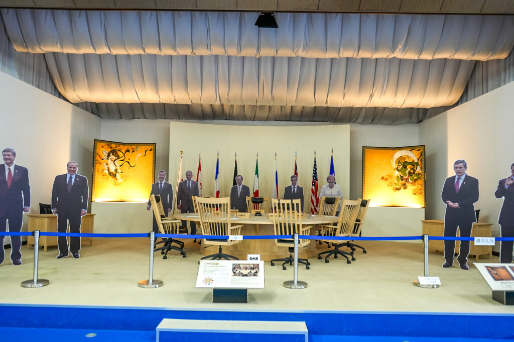 記念館の目玉は、実際の会議で使用された円卓の再現展示です。G8各国(日本、アメリカ、イギリス、フランス、ドイツ、イタリア、カナダ、ロシア)の首脳が座った椅子が配置され、当時の緊張感ある雰囲気を体感できます。各国の国旗も掲げられ、記念撮影スポットとしても人気です。