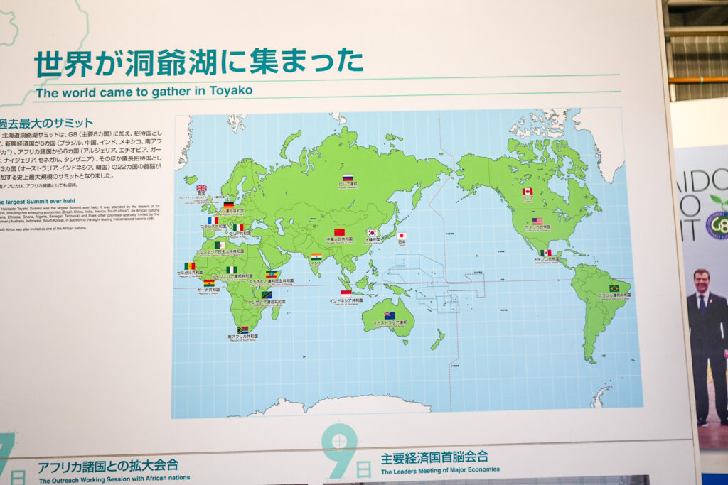 展示では、サミットで議論された環境問題、特に地球温暖化対策についても詳しく解説されています。「世界が洞爺湖に集まった」というパネル展示では、各国の位置と参加国が分かりやすく示され、国際会議の規模の大きさを実感できます。