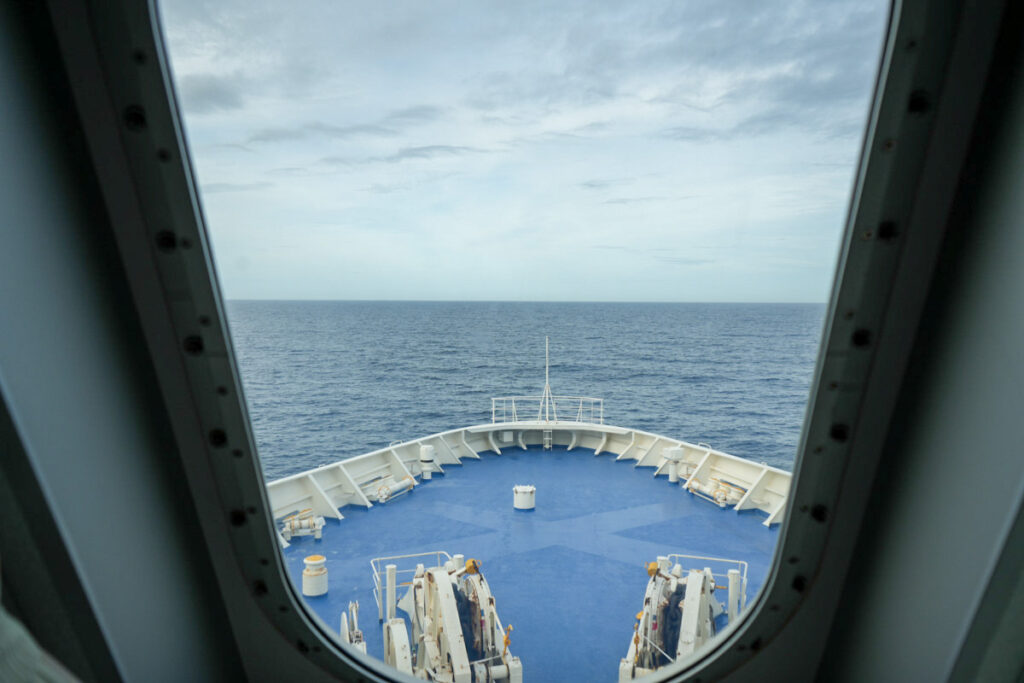 航海中、デッキに出て風を感じながら海を眺める時間は、日常から離れた贅沢なひとときでした。晴天の空の下、どこまでも続く水平線を眺めていると、時間を忘れてしまいます。