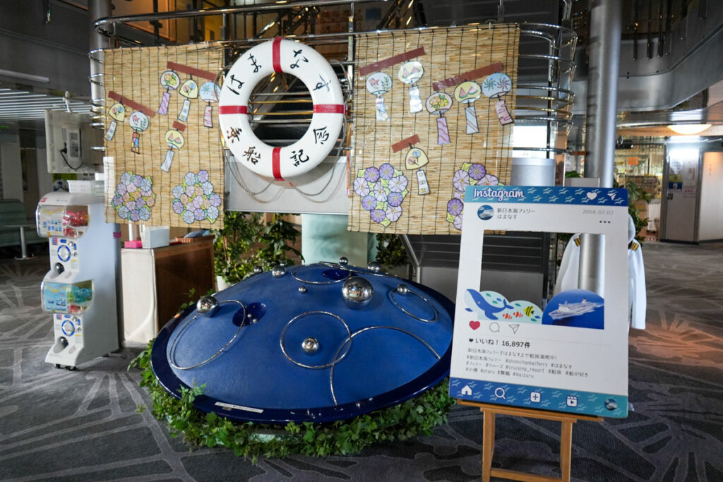 救命浮環を使ったフォトスポットには、色とりどりの短冊や飾りが添えられ、SNS映えする設えになっています。Instagram風のフォトフレームも用意され、多くの乗客が記念撮影を楽しんでいました。