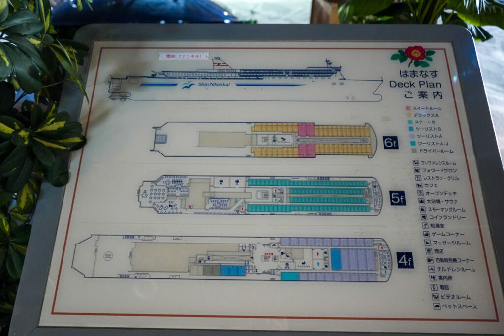 航路は日本海を南下するルート。船内のモニターに表示される航路図を見ながら、今どこを航行しているのかを確認するのも楽しみの一つです。