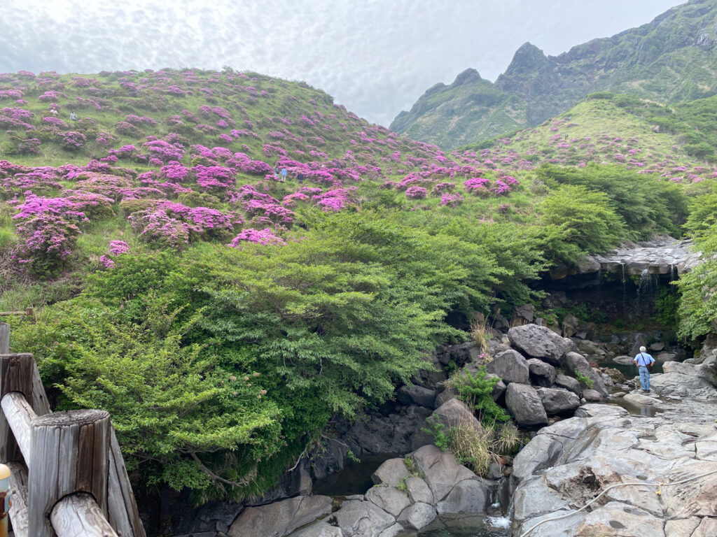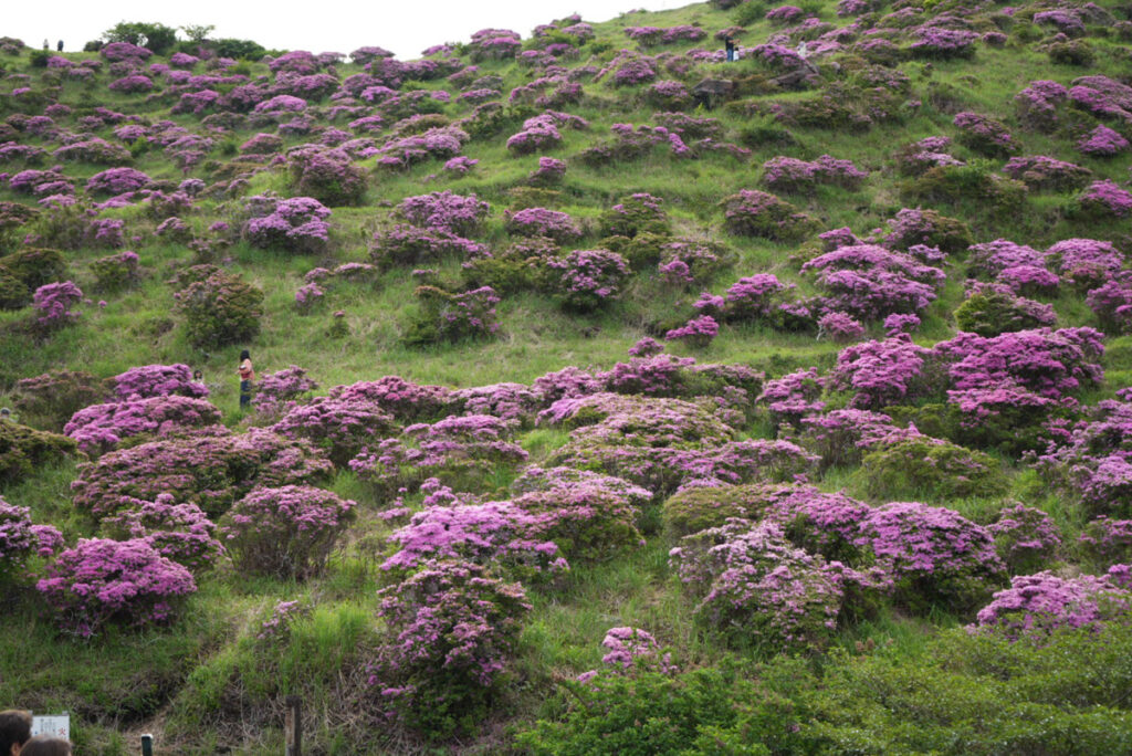 5月中旬から6月上旬の今の時期は、ミヤマキリシマが本当にきれいでした! 約5万株のツツジが山の斜面一面をピンク色に染めていて、見ているだけで心が癒されます。