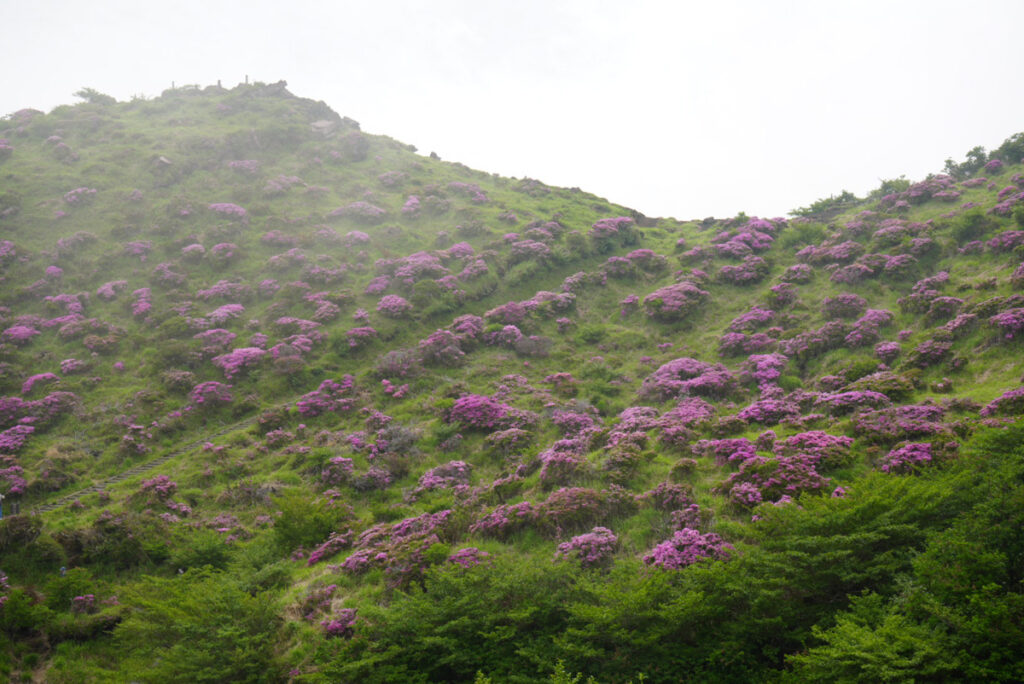 霞がかかった山々を背景に、鮮やかなピンクのツツジがとても映えていました。写真では伝わりにくいですが、現地で見る迫力は格別です。