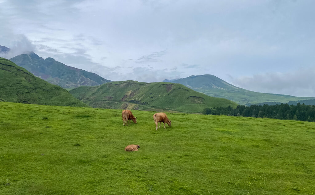 仙酔峡へ向かう道中も、阿蘇の雄大な山々の景色が本当に素晴らしかったです! 車窓から見える緑の草原と山々のコントラストは、まるで絵画のよう。走っているだけでワクワクしてきます。