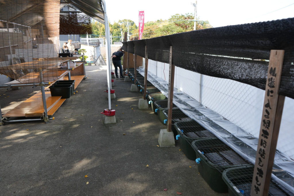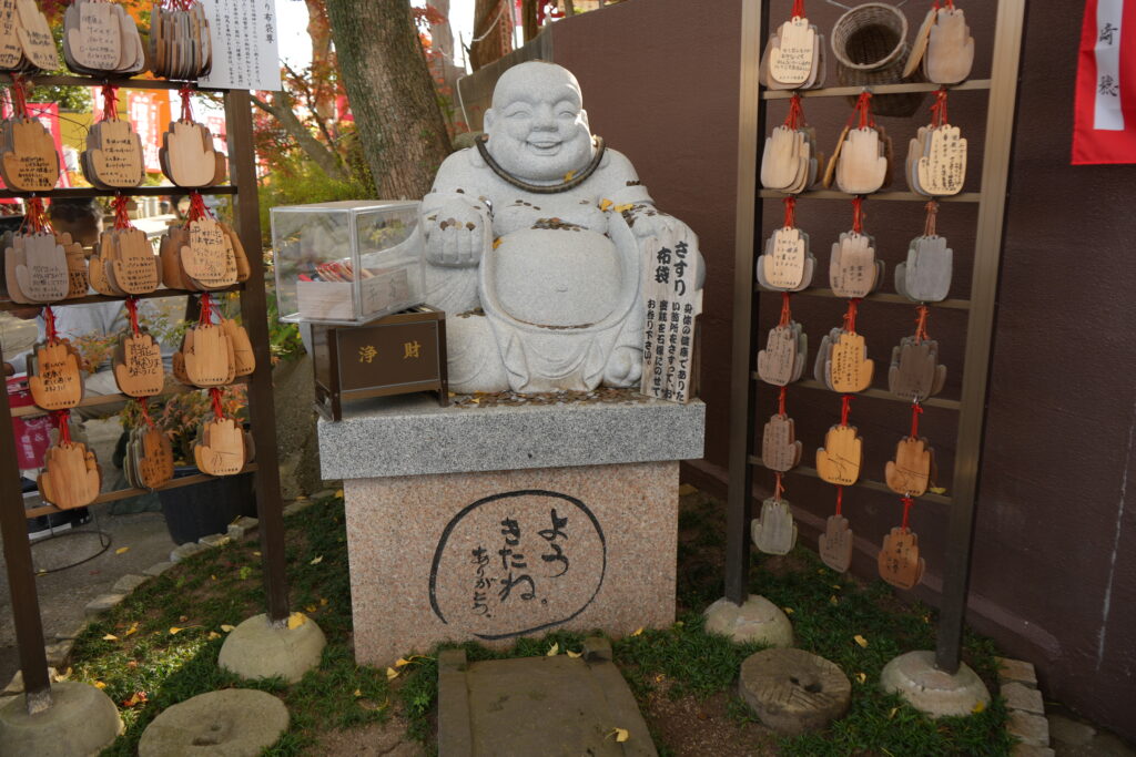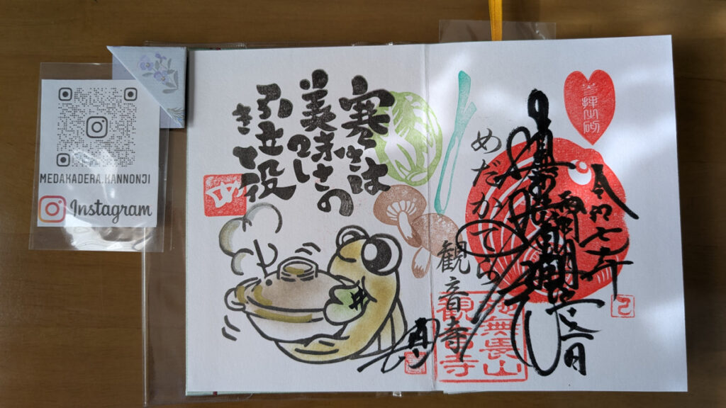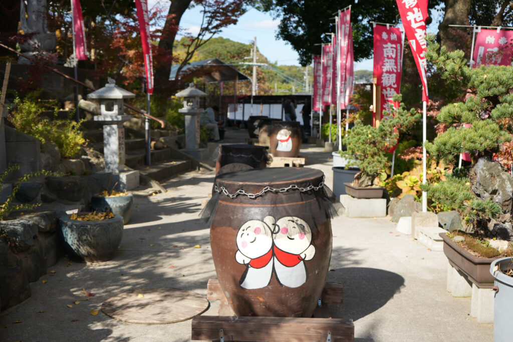 境内の各所に置かれた水がめには、たくさんのメダカが泳いでいました。中でも印象的だったのが、観音様が描かれた大きな水がめです。水がめを覗き込んで、メダカを眺めるのも風情があります。
