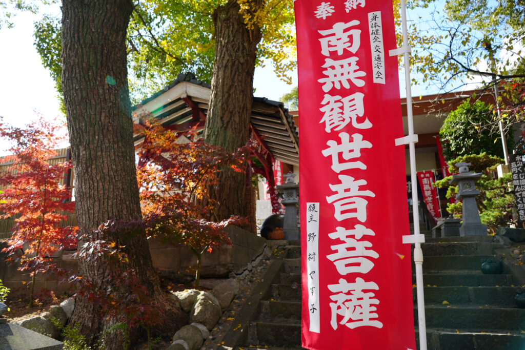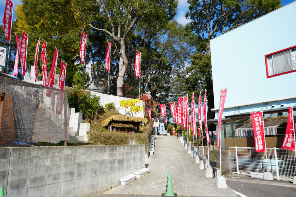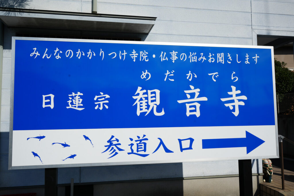 この観音寺、地元では「めだか寺」として親しまれているユニークなお寺です。境内に足を踏み入れると、まず目に飛び込んでくるのが参道に立ち並ぶたくさんの赤い幟旗。
