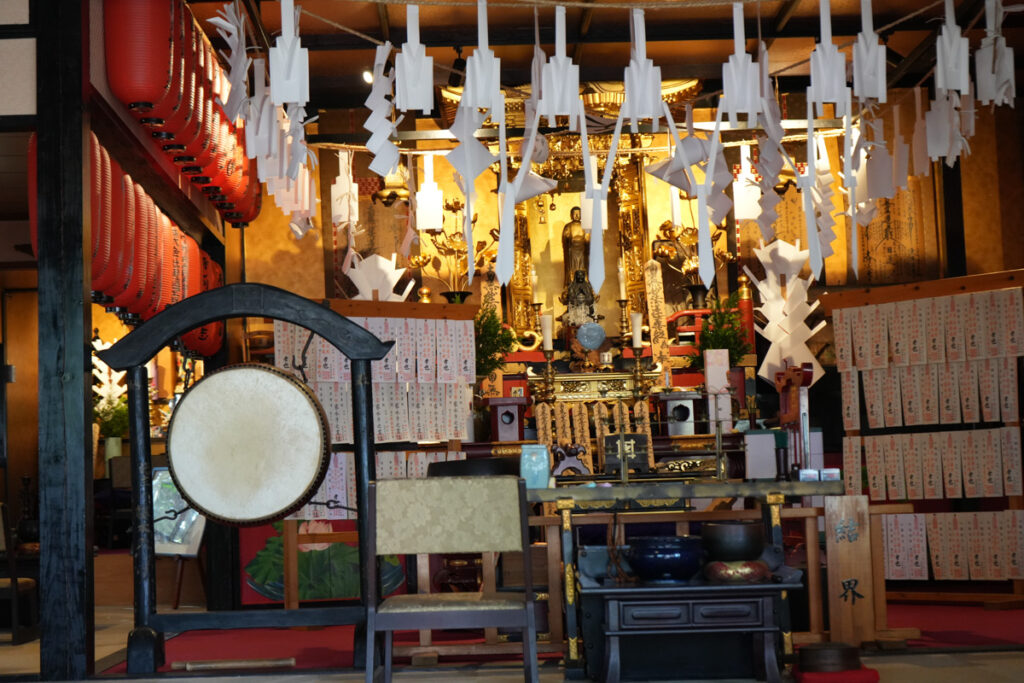 本堂の中に入ると、煌びやかな仏壇が目に入りました。金色に輝く仏像や装飾品が並び、静かで厳かな雰囲気に包まれています。外のシャボン玉の賑やかさとは対照的な、落ち着いた空間でした。