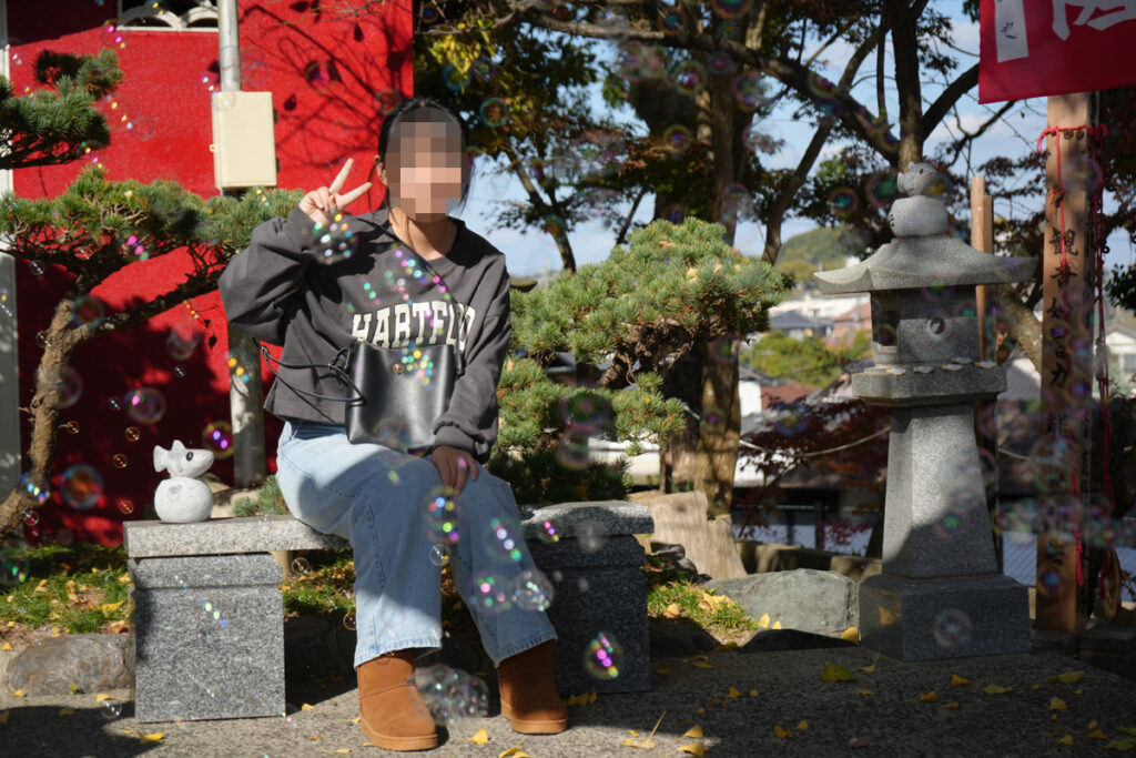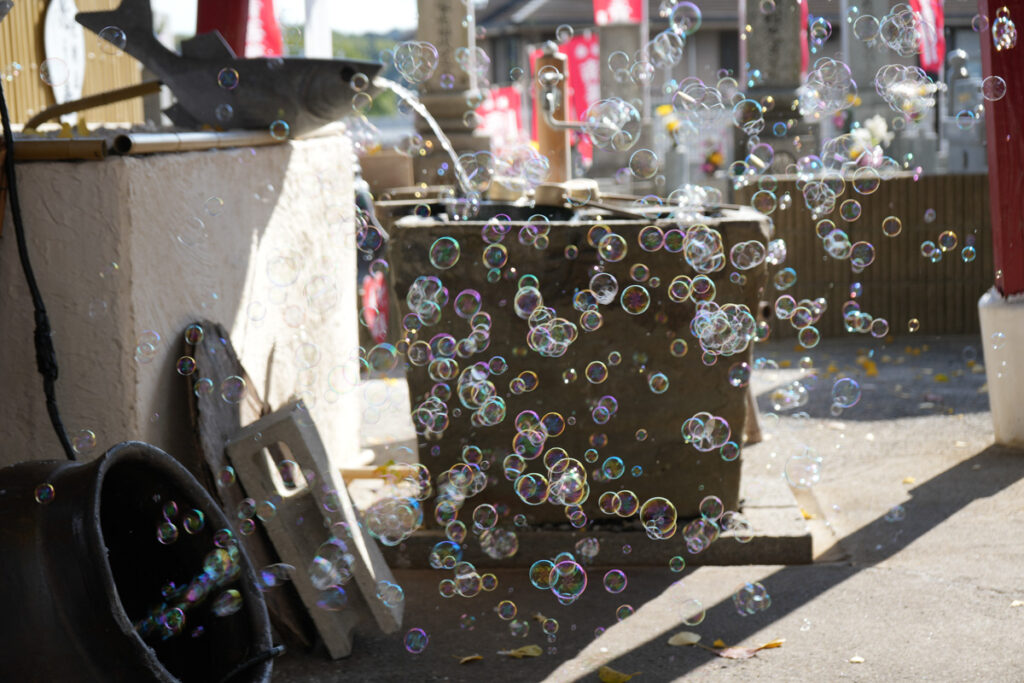 境内にはシャボン玉製造機が設置されていて、常時シャボン玉が舞い上がっています。キラキラと光るシャボン玉が境内を漂う様子は、なんとも幻想的で、まるで別世界に迷い込んだような気分になります。