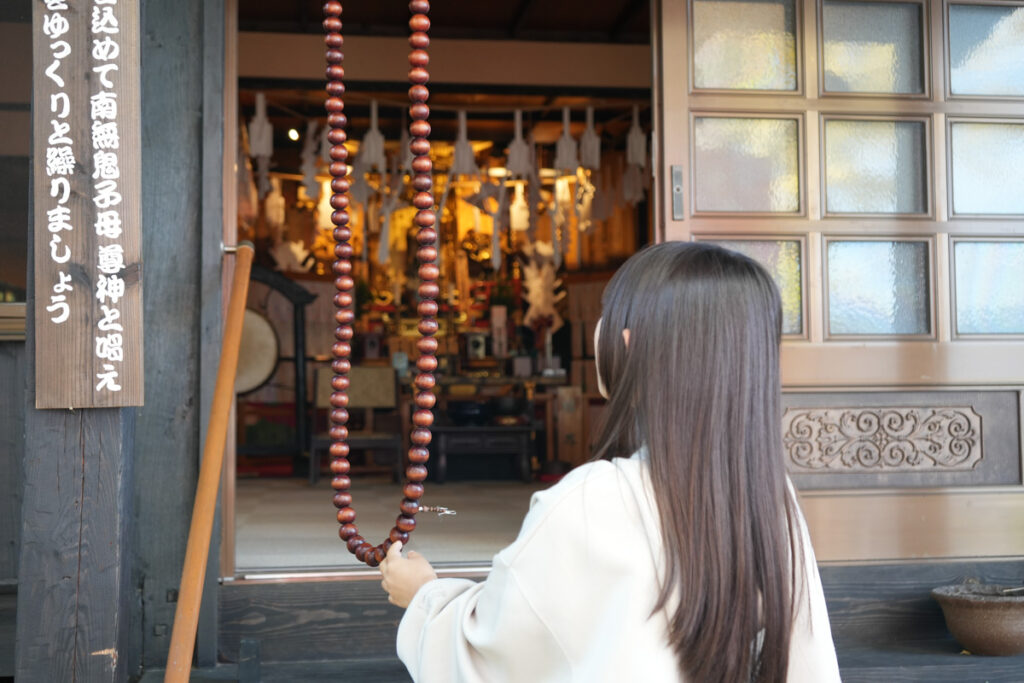 本堂の前には、人の背丈ほどもある巨大な数珠が置かれていました。この数珠を回しながらお参りするのですが、みんなで一緒に回すと、なんだかご利益がありそうな気がします。