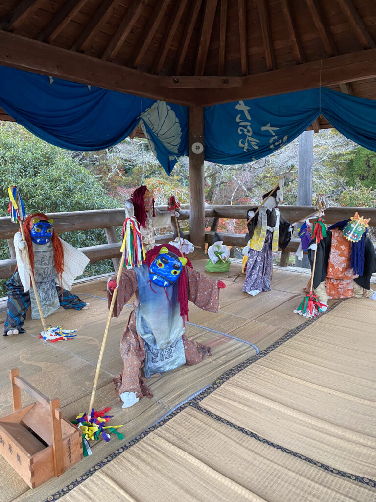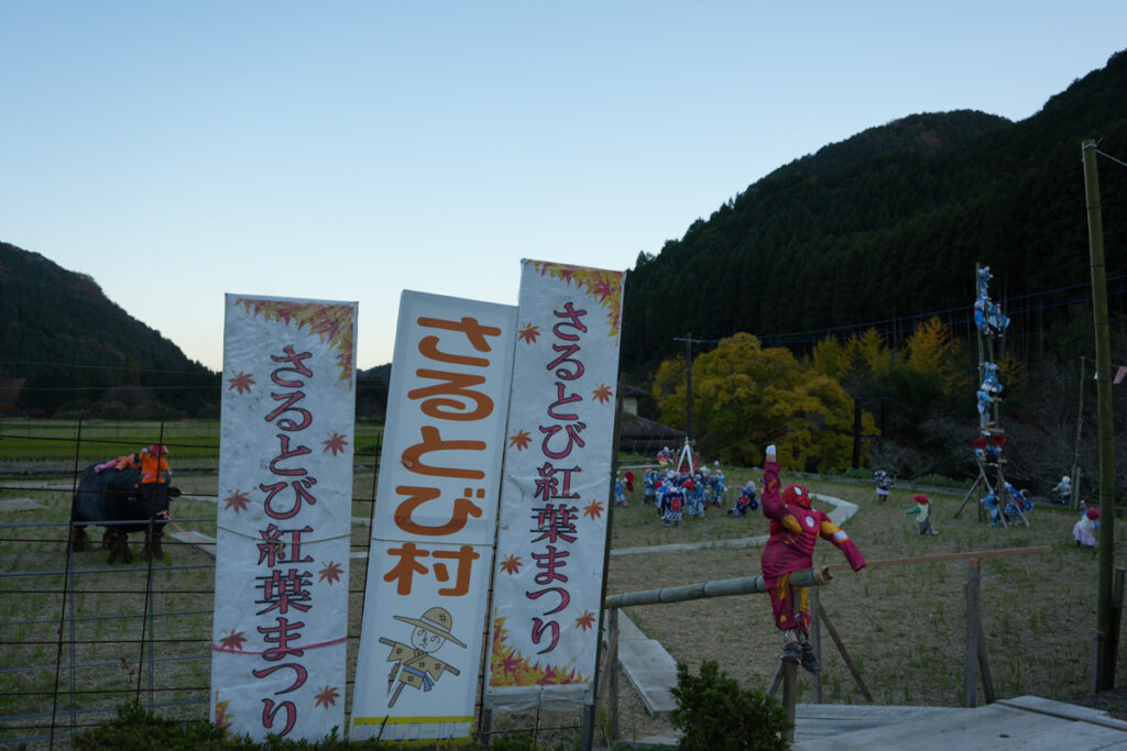 さるとび村は、大分県中津市山国町の山間にある小さな集落です。この時期、「さるとび紅葉まつり」が開催されていて、村中に案山子(かかし)の人形たちが飾られていました。