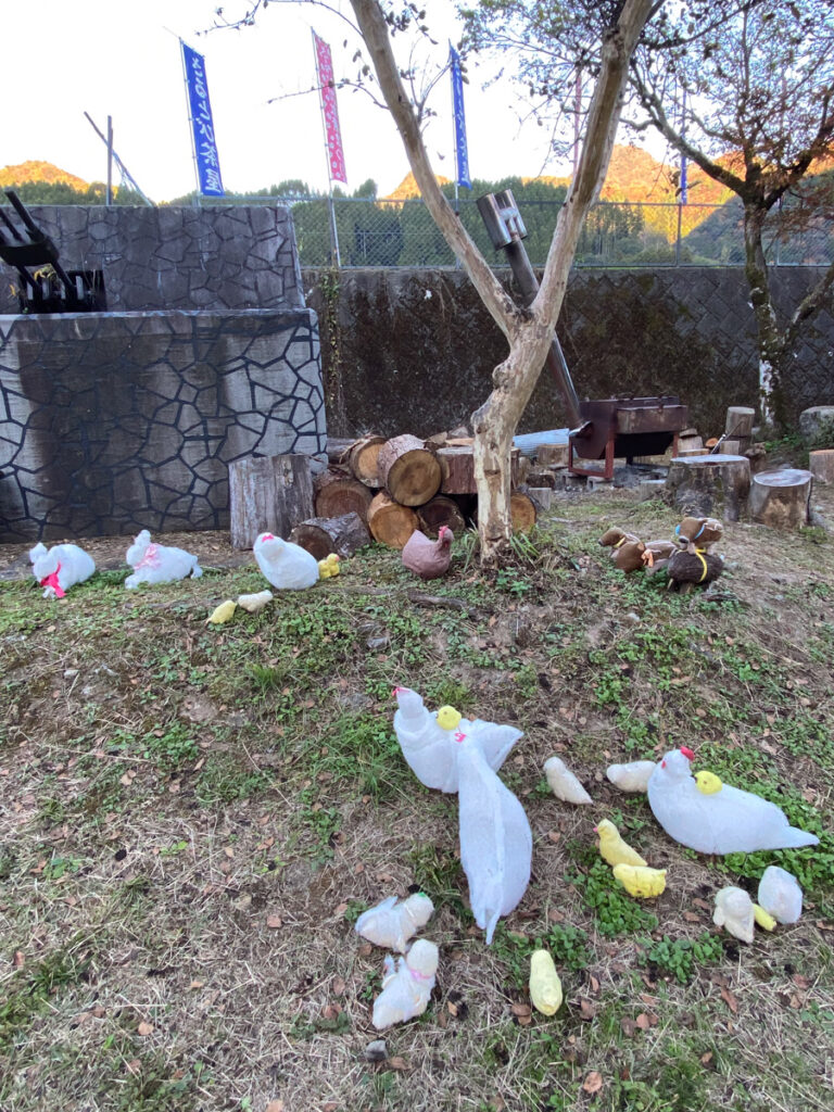案山子だけでなく、にわとりの案山子?もたくさん飾られていました。白や茶色のにわとりやひよこが木の下に集まっている様子は、なんだかほのぼのとしていて癒されます。