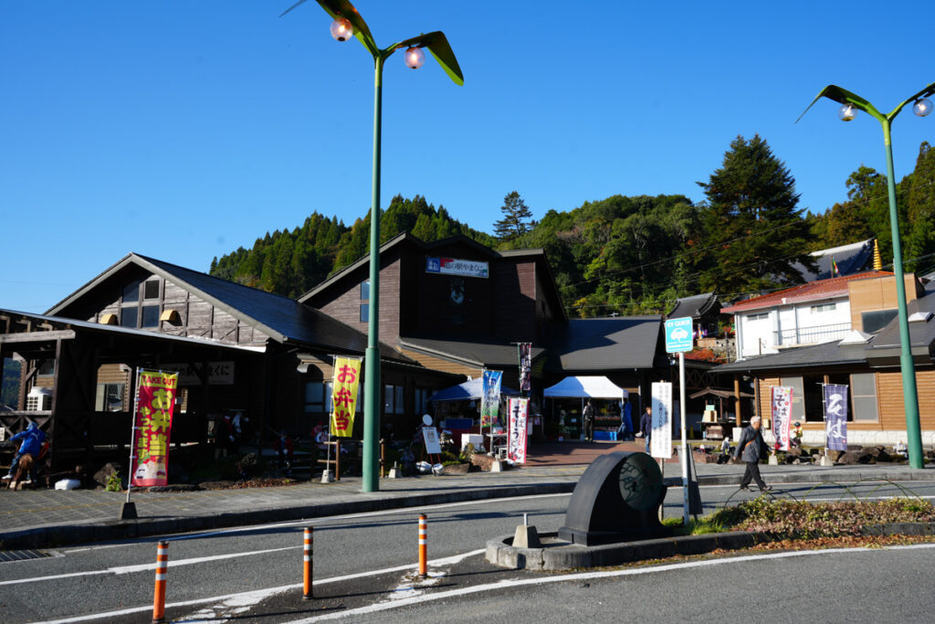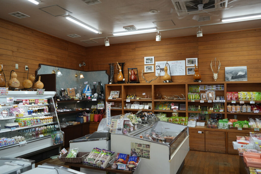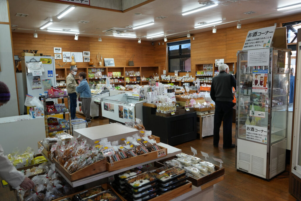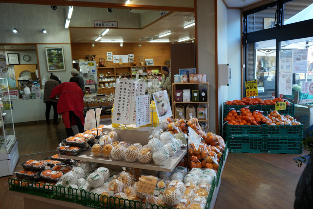 物産館では、地元産のみかんがたくさん並んでいました。山国の新鮮な野菜や加工品も豊富で、お土産選びにも困りません。