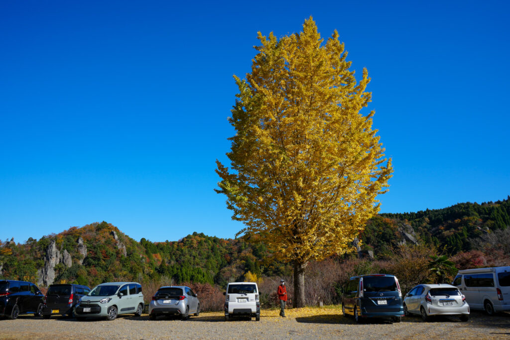 ここは玖珠町古後にある展望駐車場で、紅葉の名所として知られています。駐車場に入ると、すぐに目に飛び込んできたのが、青空を背景に黄金色に輝く大きな銀杏の木でした。