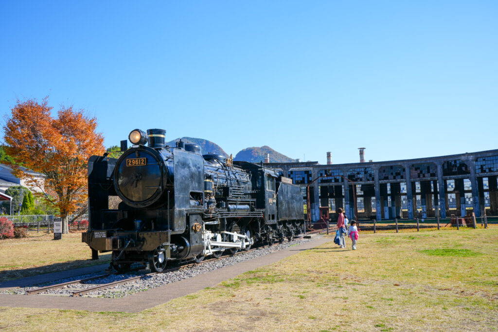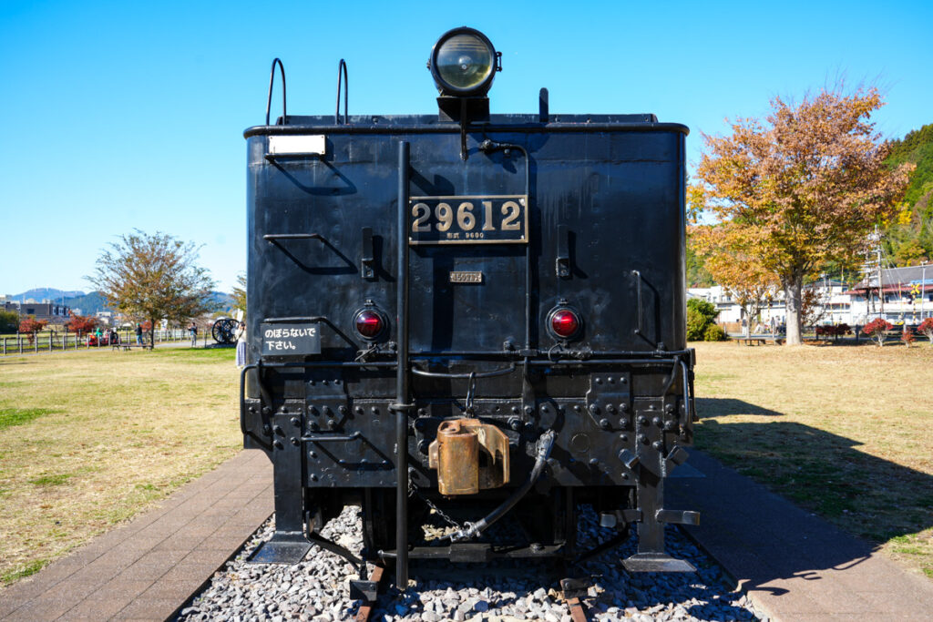 公園に入ると、まず目に飛び込んでくるのが、保存されている蒸気機関車29612号です。黒く重厚な車体が、秋の青空の下で堂々とした姿を見せています。
