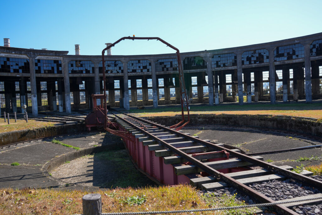 背景には三角形の山(万年山)が見え、その手前には半分崩れかけた機関庫の建物があります。この機関庫は、昭和9年(1934年)に建設された扇形の機関車格納庫で、かつては蒸気機関車の整備拠点として活躍していました。