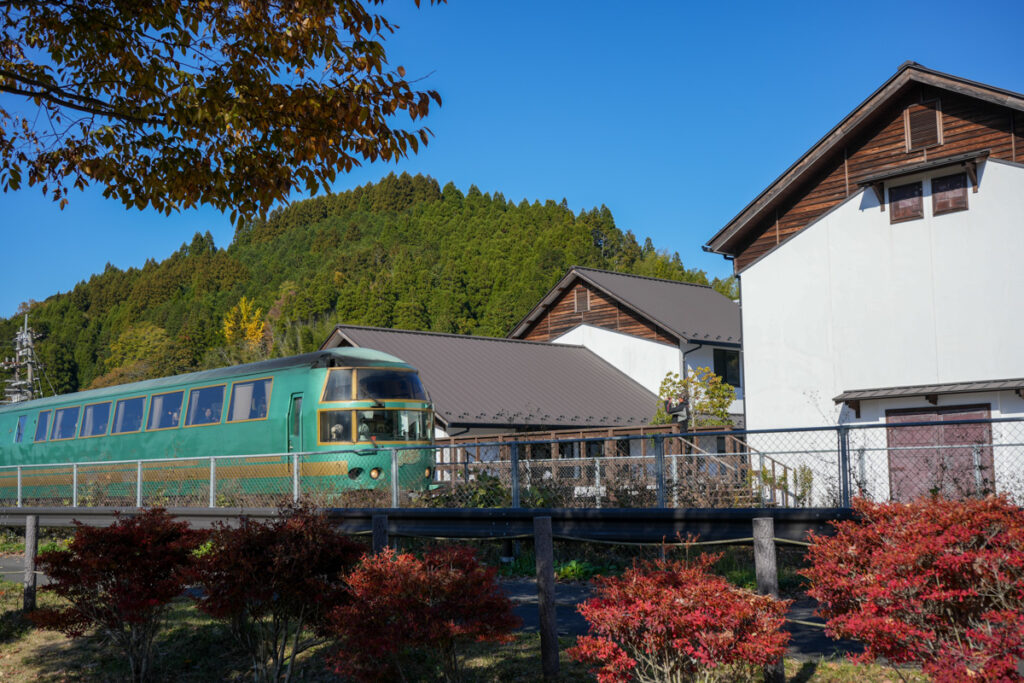 見学していると、公園の横を特急「ゆふいんの森」号が走っていきました! 緑色の美しい車体が、紅葉と機関庫の風景の中を颯爽と通過していく様子は、まさに絶好のシャッターチャンスです。