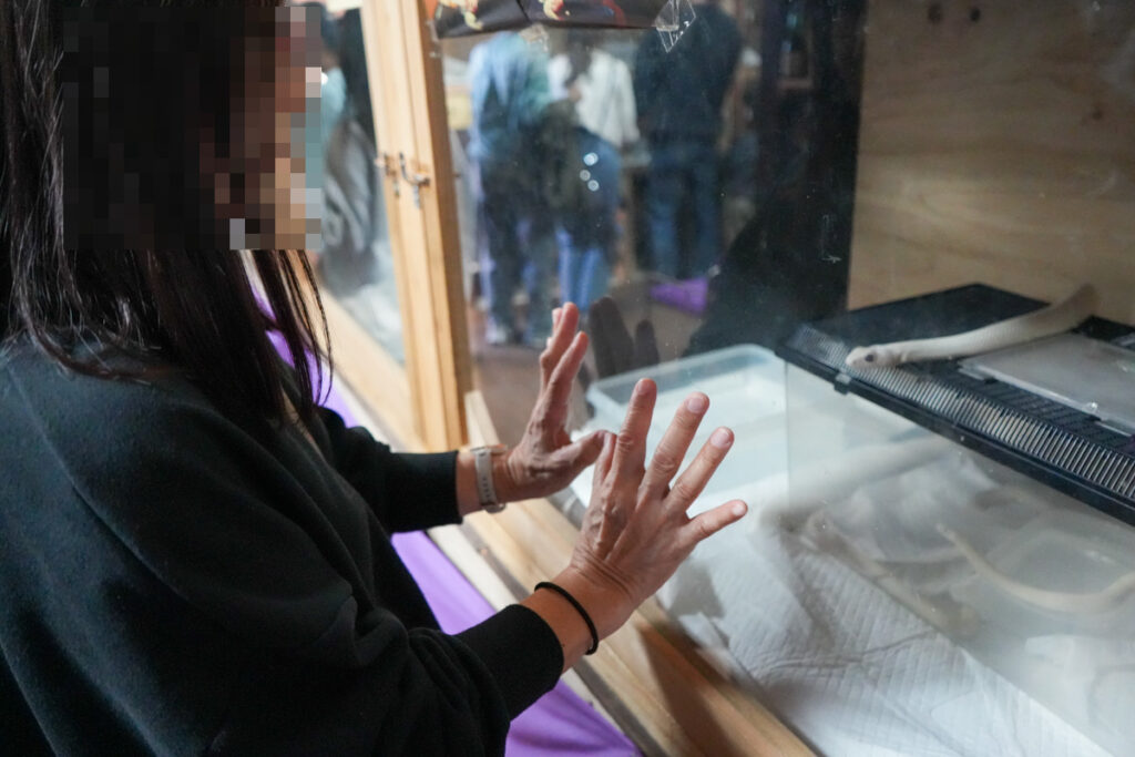 参拝所には、ケースの中に数匹の白蛇が飼育されています。スタッフの方から「ケースに手をかざしてみてください」と言われ、実際に手を近づけてみました。