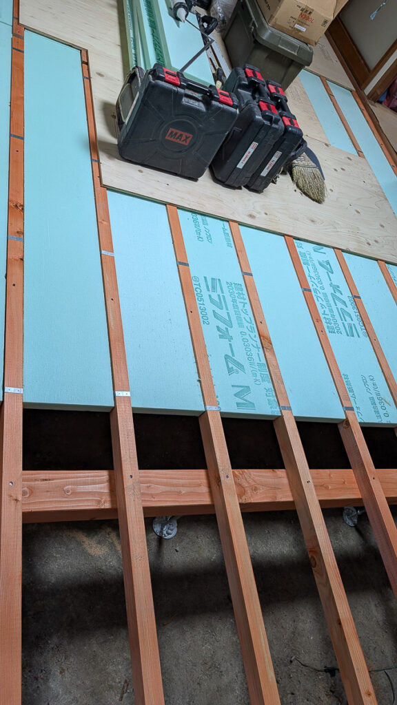 新しい床材が搬入され、根太を組み、断熱材(ミラフォーム)を敷き、コンパネを貼り、床板を張る。和室の一部ですが、見違えるように生まれ変わりました。
