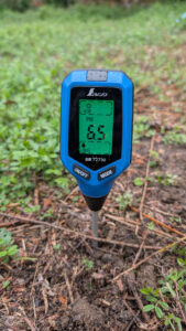 畑仕事を始める前に、土壌測定器でpH値を測定しました。