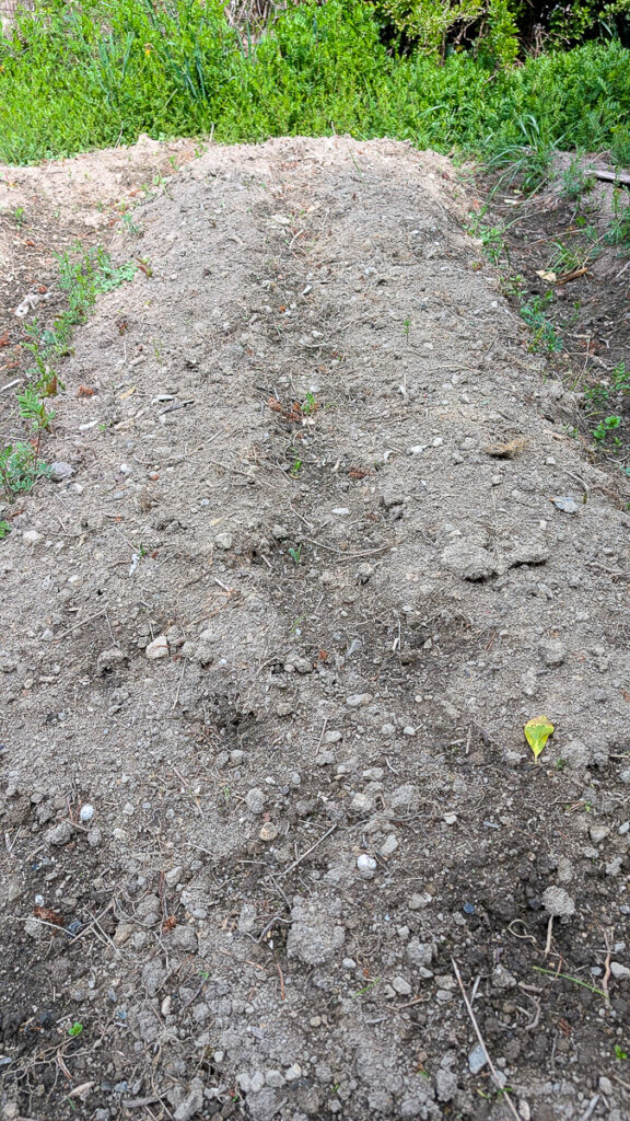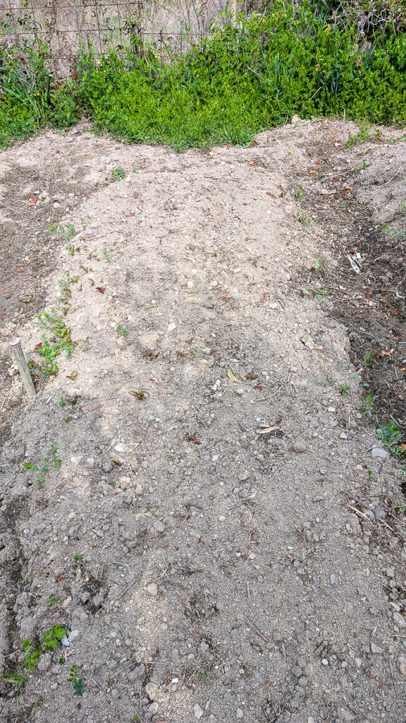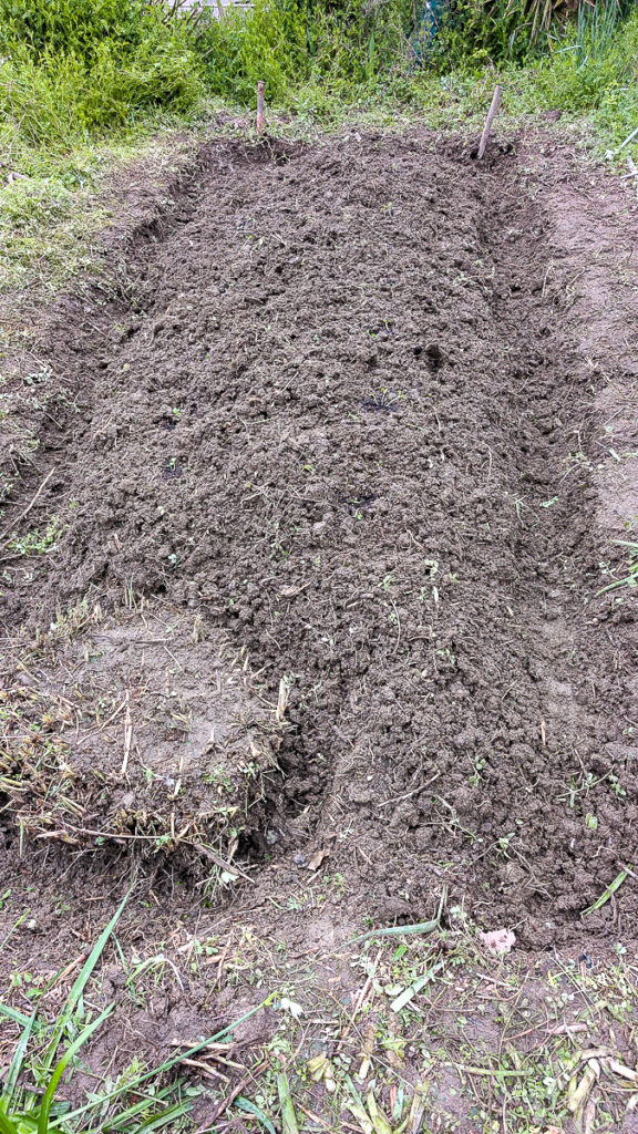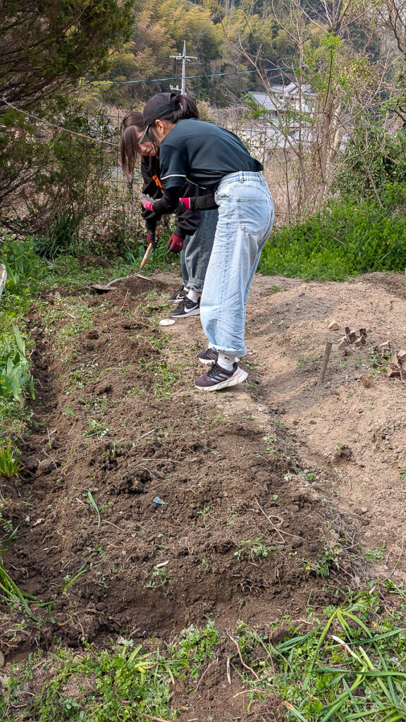 前回残っていた中段の畑の空きスペースに、新たに3畝目を造成しました。今回は家族も参加し、一緒に畝づくりに取り組みました。