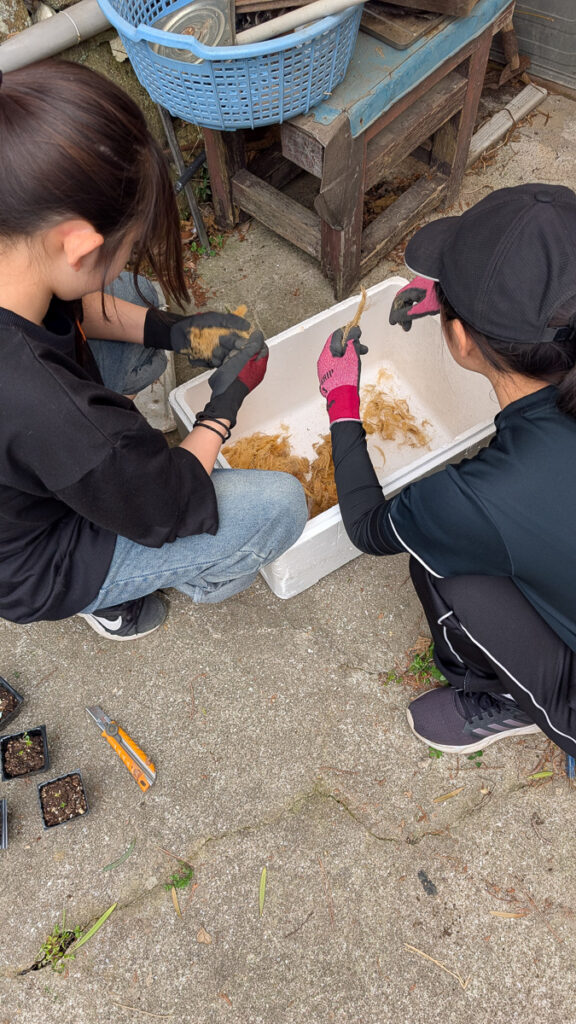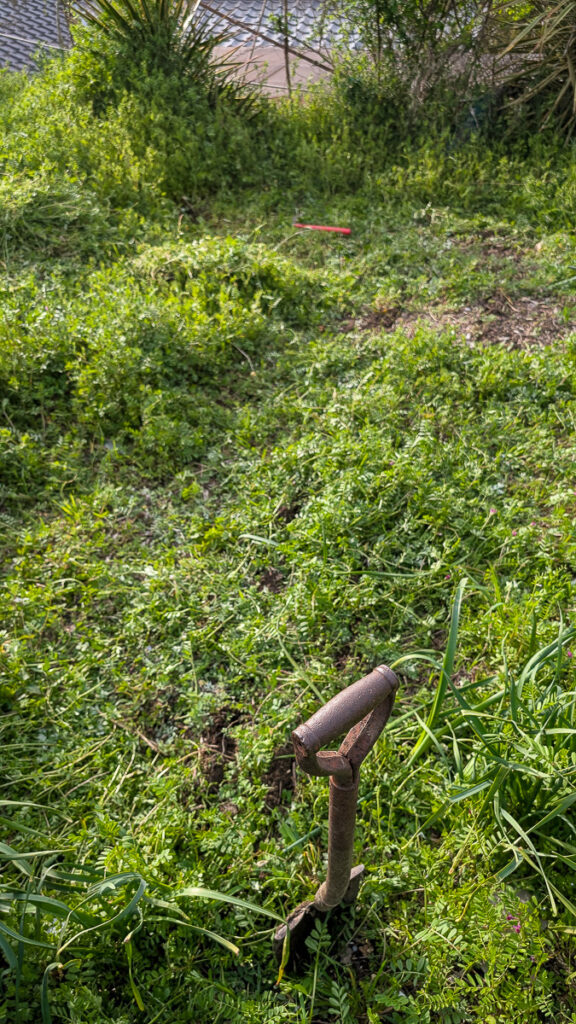 上段の畑は、中段とは少し雰囲気が違いました。日当たりは良好です。しかし、一角にイネ科の植物の根が蔓延っているエリアがあり、そこだけ撤去が難航しました。今回は悪天候も重なったため、そのエリアは次回に持ち越しとなりました。