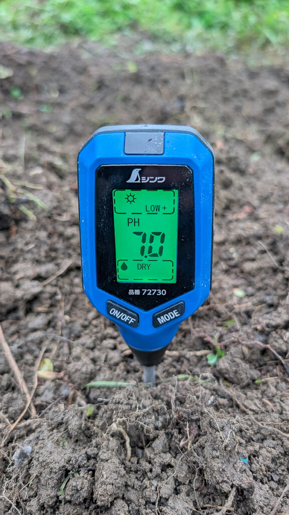 自然農法的な対処としては、草マルチや有機物の投入を続けることで、有機物の分解により徐々に弱酸性側へ移行することが期待できます。焦らず観察していきます。